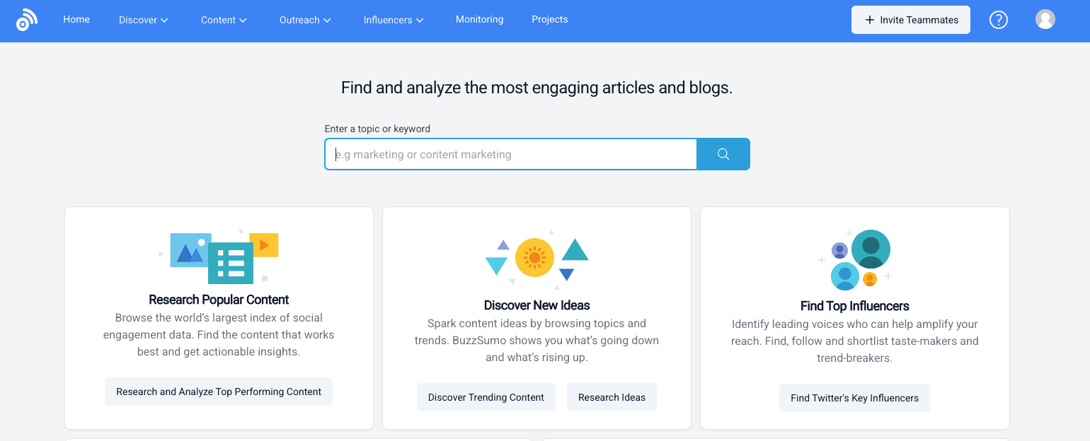O BuzzSumo reúne bilhões de artigos e trilhões de interações sociais em um aplicativo de fácil pesquisa, ajudando seu conteúdo a se destacar, gerar engajamento e ser amplamente compartilhado.