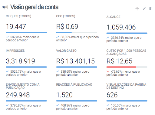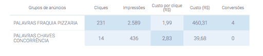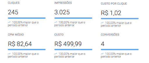 Comparado a investimentos anteriores, os cliques, impressões e conversões cresceram 100%, com o valor por clique abaixo.