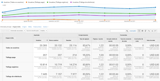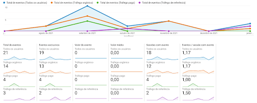 Nesta imagem podemos observar de onde se originou cada evento, de onde os usuários partiram até a entrada no site. Esses cliques de eventos podem ser oriundos das redes sociais, de campanhas pagas e da performance de SEO que é o tráfego orgânico no site, sem necessidade de investimentos a parte para as plataformas.