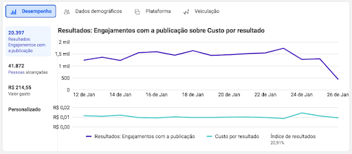 ORÇAMENTO TOTAL: R$1.000,00 ORÇAMENTO USADO ATÉ O PERÍODO DE AFERIÇÃO: R$865,84 (DE 12/01/2022 ATÉ 25/01/2022) DURAÇÃO 19 DIAS ESTRATÉGIA UTILIZADA:1 – CAMPANHA DE ENGAJAMENTO