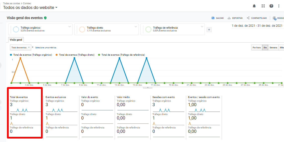 Na imagem acima, demonstramos os eventos realizados no site no mês de novembro de 2021. Esses eventos rastreáveis foram feitos via WhatsApp. Além desses, diversos contatos são feitos através do telefone da empresa.Imagem: Demonstração dos eventos de tráfego orgânico, realizados no mês de dezembro de 2021 no site.Através do tráfego orgânico do Google, o escritório contábil conseguiu captar clientes potenciais. Tudo isso com a implantação de estratégias de SEO realizadas pela nossa agência.