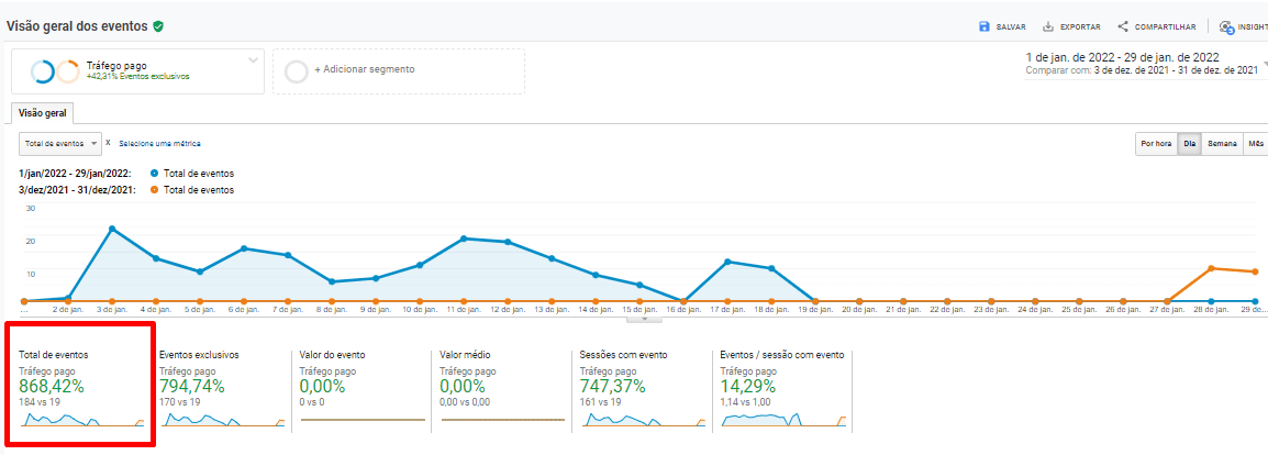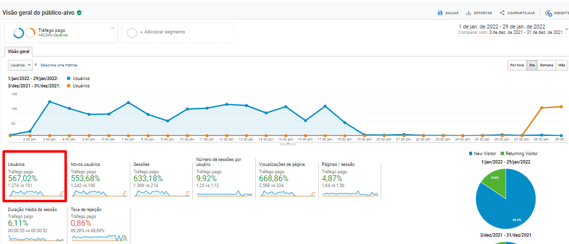 Na imagem, podemos observar um crescimento de 567% em janeiro de 2021 em comparação com dezembro de 2020. Mesmo com estratégias semelhantes de investimento em um determinado período do mês, obtivemos um crescimento significativo em janeiro de 2022.