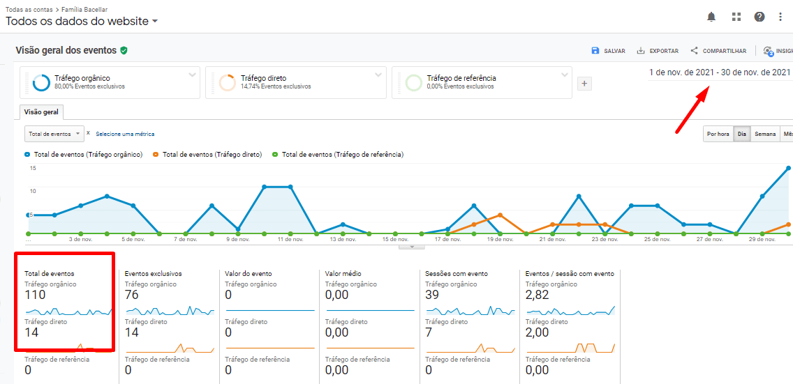 Aqui podemos verificar os eventos realizados no site no período. Esses eventos rastreáveis são contatos realizados pelo WhastsApp do site. Além desses, diversos contatos são feitos através do telefone da empresa.Imagem: Demonstração dos eventos de tráfego orgânico, realizados no mês de novembro de 2021 no site.Com o retorno conseguido com o tráfego orgânico do Google, a imobiliária teve a possibilidade de captar clientes potenciais. Esse resultado foi possível com a utilização de estratégias de SEO realizadas pela Agência Mais Resultado.Nesta outra imagem, vemos o tráfego orgânico desde o início do projeto até novembro de 2021. Veja os números incríveis atingidos: