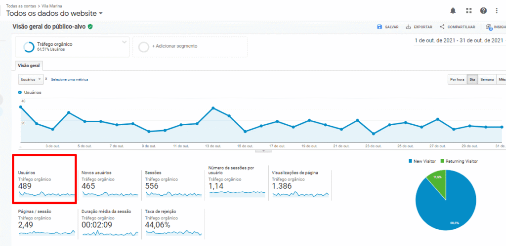 O trabalho de SEO foi iniciado em janeiro de 2019. Antes do projeto, o site não recebia nenhum tráfego orgânico, o que resultava na perda de potenciais clientes. Na outra imagem, podemos destacar o tráfego orgânico do site da casa de repouso para idosos no mês de outubro de 2021. Foram contabilizados 489 acessos orgânicos nesse mês, representando um crescimento expressivo desde o início do projeto de SEO. Apresentamos também um gráfico que ilustra o crescimento do tráfego orgânico mensal, comparando o período antes e depois da implementação do projeto.