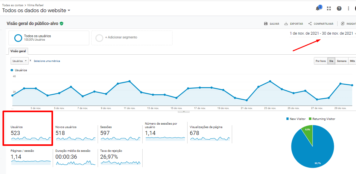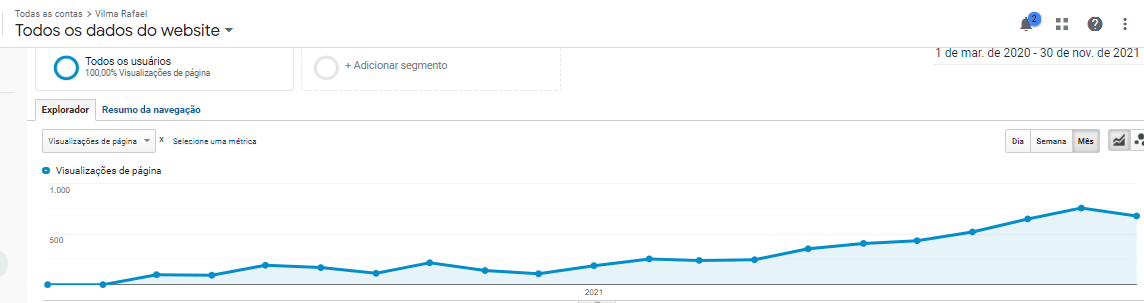 Na outra imagem, mostramos o tráfego orgânico desde o início do projeto até novembro de 2021, revelando números impressionantes.